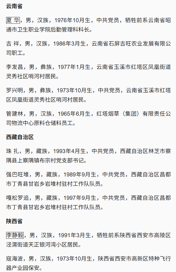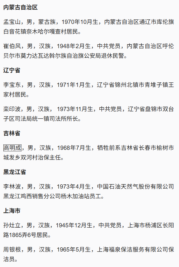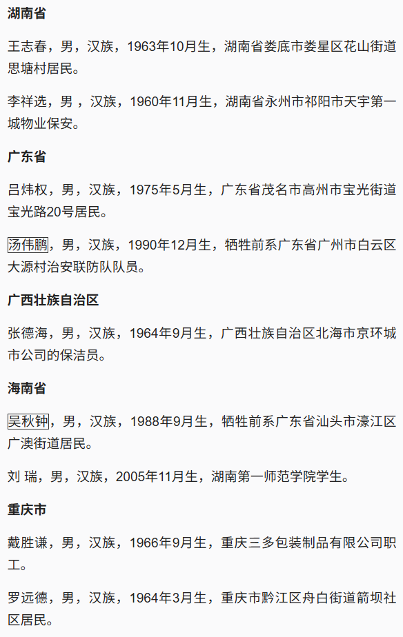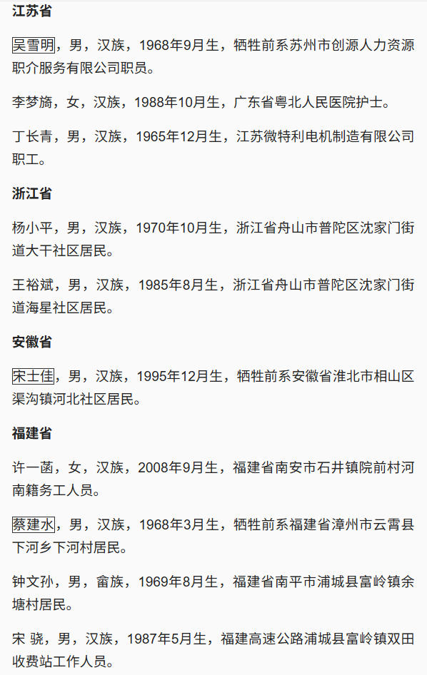 此次榜单中,吴雪明、宋士佳、蔡建水、吴秋钟、夏华、李静毅等11位勇士为保护他人生命财产安全献出了宝贵生命。