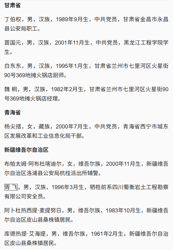 上榜的见义勇为勇士,有在汛期暴雨洪水中向险而行、抢险救出多人的李风国、樊兵兵、汤伟鹏、朱旭阳等;有在犯罪嫌疑人持刀行凶时挺身而出、英勇搏斗的崔伯风、高明成、许一菡、陈文彬、邹玉华等;有在深达40米低温缺氧井中救出幼童的女辅警布帕太姆·阿布杜喀迪尔;有第27批援坦桑尼亚中国医疗队队长张军桥为施救当地民众英勇牺牲,用生命践行中非人民友好精神。