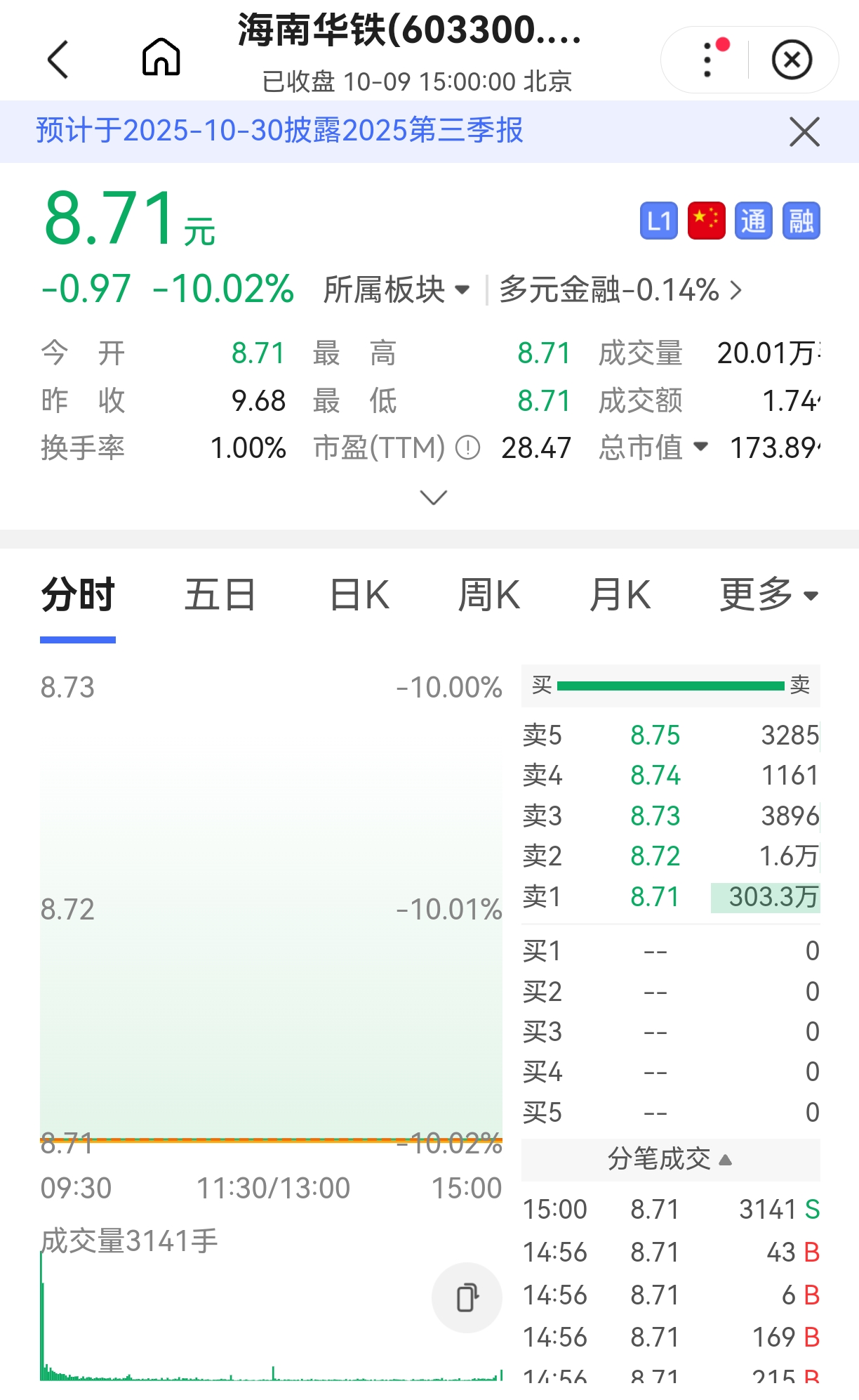 2025年10月9日,国庆节后首个交易日,海南华铁(603300)开盘即一字跌停,股价报收8.71元/股,封单金额超过14亿元。