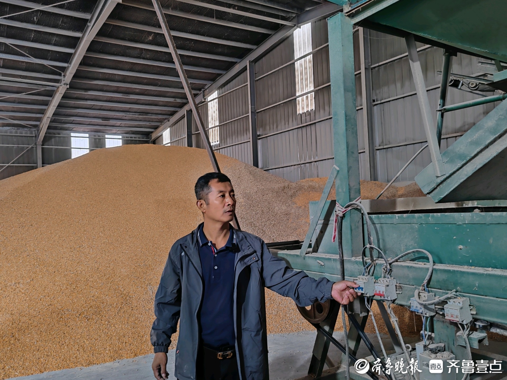 9日下午,在济阳区的永盛家庭农场,机器轰鸣,烘干好的玉米堆放在厂房内。