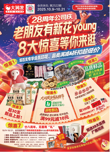 10月9日,大润发迎来28周年公司庆,围绕“老朋友有新花young 8大惊喜等你来逛”的主题,推出满额抽奖、跨品类满减等系列活动,多重优惠和特别礼遇等吸引了众多消费者的青睐。