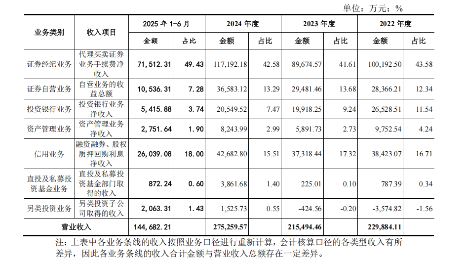 伴随招股书更新,东莞证券最新业绩情况得到公开。2022年至2024年以及2025年上半年,公司营业收入分别为22.99亿元、21.55 亿元、27.53亿元及14.47亿元,净利润分别为7.91 亿元、6.35 亿元、9.23 亿元及4.88亿元。