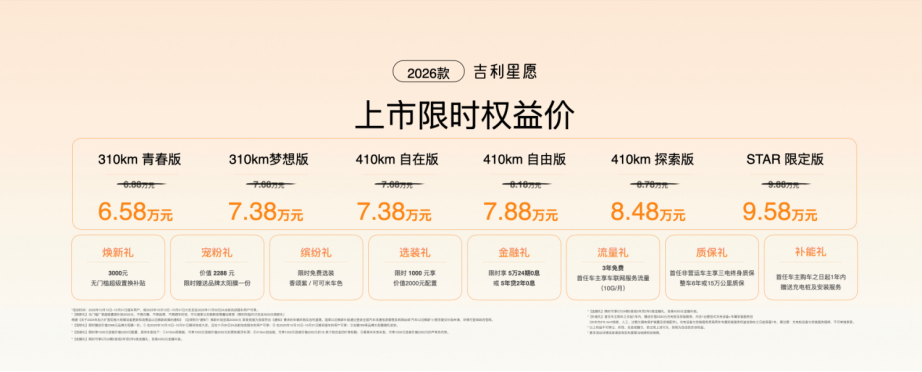 2026款吉利星愿上市限时权益价为6.58万元–9.58万元。同时为回馈用户支持,同步推出八重限时购车权益,包括焕新礼、宠粉礼、缤纷礼、选装礼、金融礼、流量礼、质保礼、补能礼,进一步降低拥车门槛,提升用车体验。