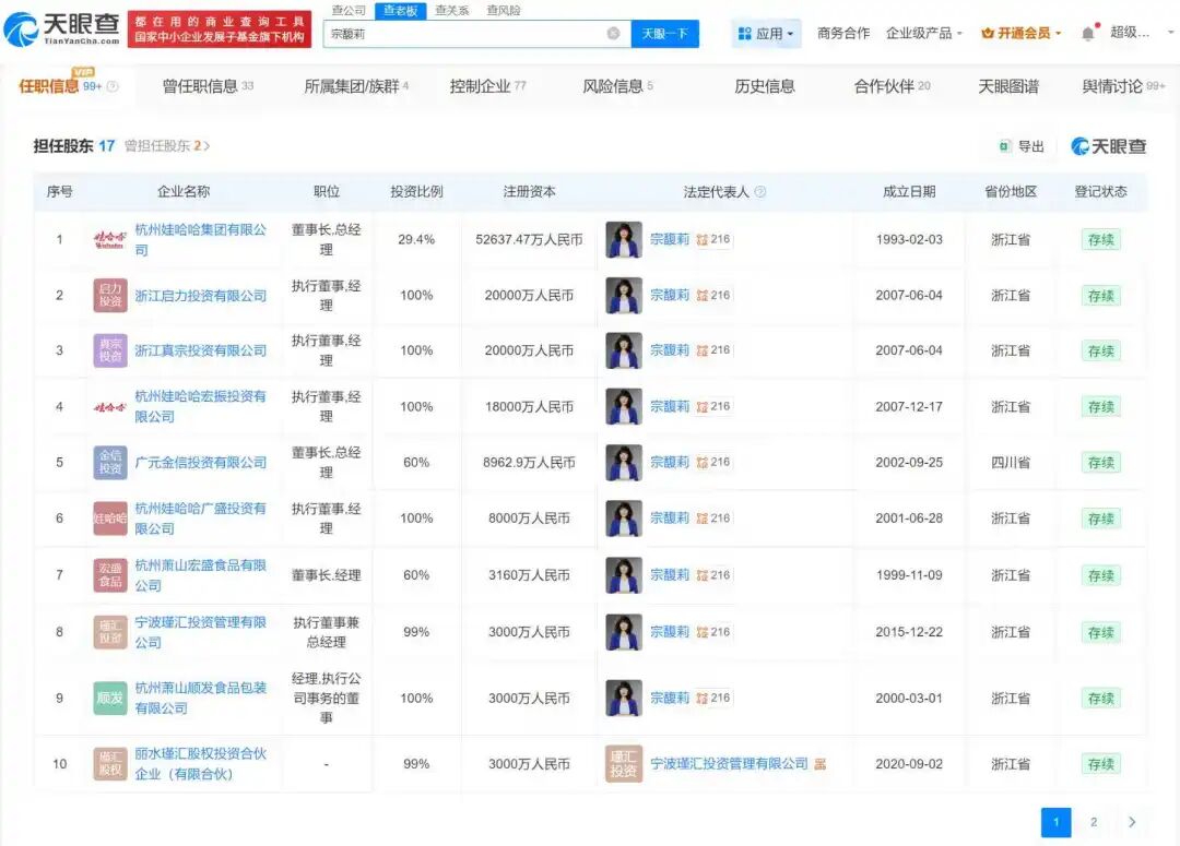 潇湘晨报查询天眼查任职信息发现,宗馥莉名下关联210余家企业,其中200余家为存续或开业状态,包括娃哈哈商业股份有限公司、杭州娃哈哈集团有限公司、杭州娃哈哈集团有限公司等,宗馥莉在上述企业中分别担任董事长、总经理等职务,并持有10余家企业股份。