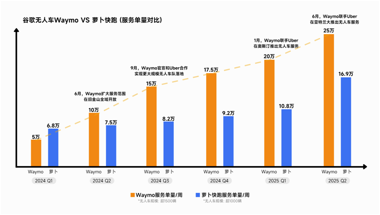 尽管谷歌Waymo安全行驶里程、海外布局暂时落后于萝卜快跑,但得益于当地开放的政策,谷歌Waymo已规模化驶入美国洛杉矶、旧金山、凤凰城、奥斯汀、亚特兰大五座城市中心,并布局了超过2000辆无人车。规模化的车辆布局也使得谷歌Waymo服务单量反超中国的萝卜快跑。谷歌Waymo还在纽约、费城在内的10多个城市同步展开测试,即将进入迈阿密、华盛顿特区以及达拉斯等城市。