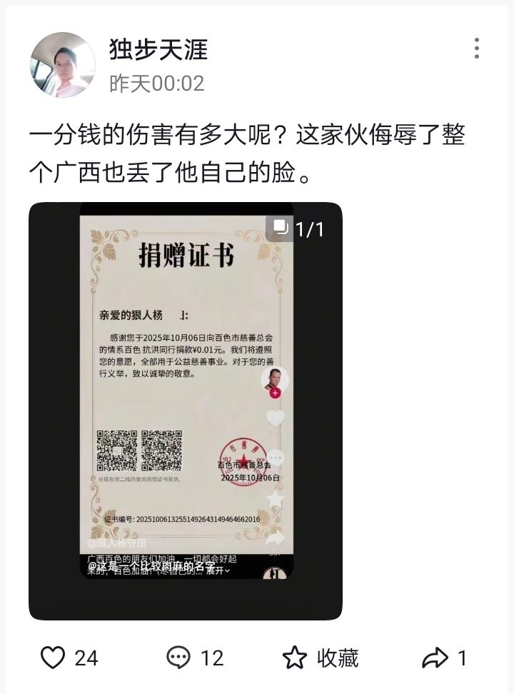 网友发布的截图还显示,一名有23万粉丝的博主“狠人杨×田”,在社交平台晒出了自己的电子捐赠证书:“亲爱的狠人杨×田:感谢您于2025年10月6日向百色市慈善总会的情系百色抗洪同行捐款0.01元。我们将遵照您的意愿,全部用于公益慈善事业。对于您的善行义举,致以诚挚的敬意。”记者扫该证书上的二维码发现,该证书为真,系百色市慈善总会所发。