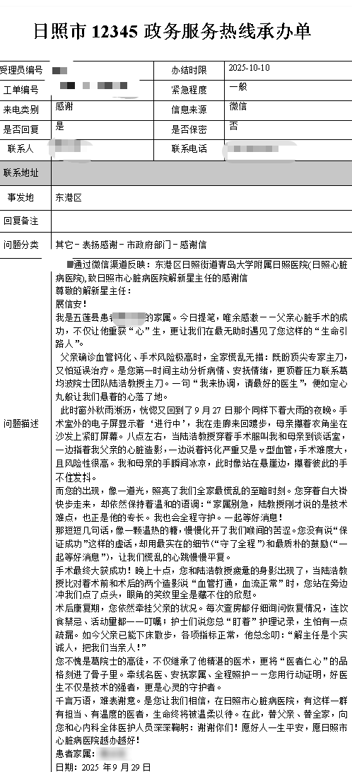 一封经由12345热线转来的感谢信,悄然抵达日照心脏病医院。