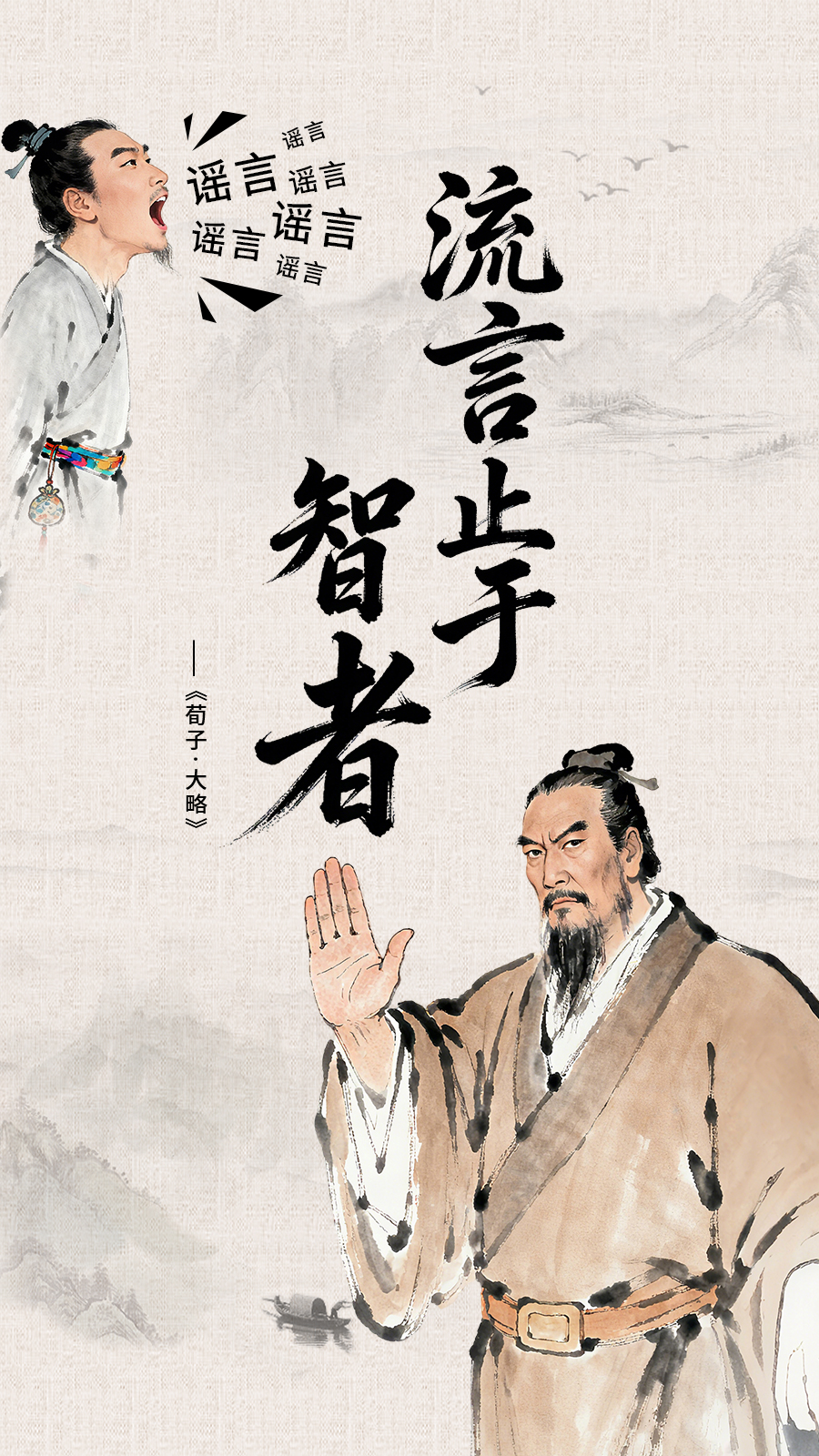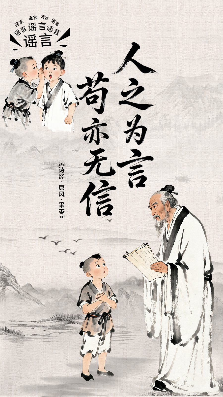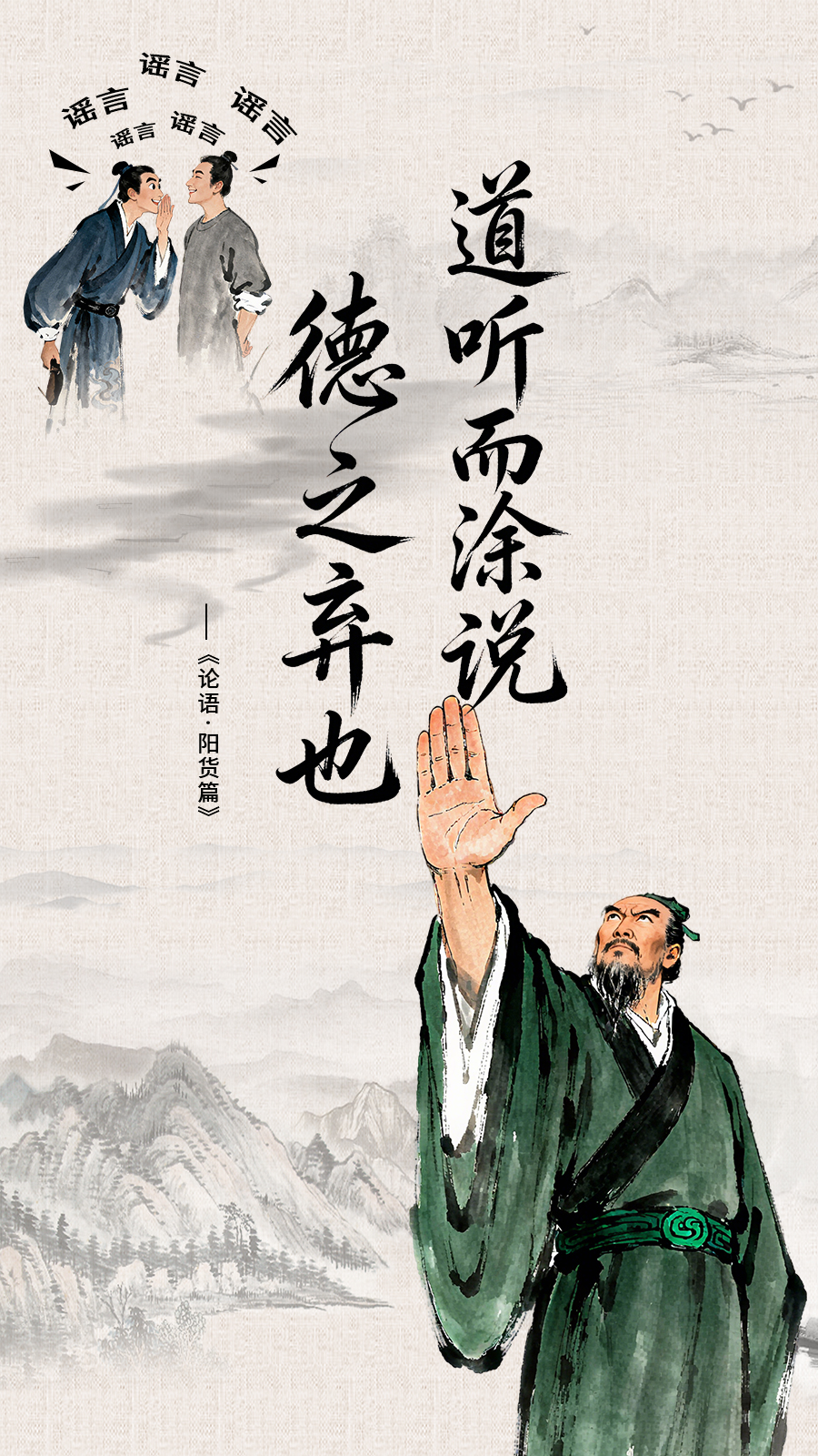 网络谣言如数字病毒,一条误传即可毁掉个人名誉、煽动社会恐慌、吞噬公共信任。《古训今鉴:三语破谣》借儒家文化千年之声,制作三幅海报,一图一句——“道听而涂说,德之弃也”示造谣之耻;“流言止于智者”亮判伪之锋;“人之为言,苟亦无信”呼看客转发须慎。让先贤的智慧,为指尖时代的你我,打一剂清醒针。