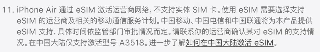 苹果官网现已显示,iPhone Air 通过 eSIM 激活运营商网络,不支持实体 SIM 卡。使用 eSIM 需要选择支持 eSIM 的运营商及相关的移动通信服务计划。中国移动、中国电信和中国联通将为本产品提供 eSIM 支持,具体时间依监管部门审批情况而定。请联系运营商确认其对 eSIM 的支持情况。