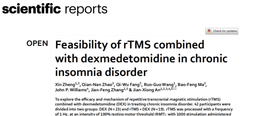 慢性失眠不仅降低患者生活质量和社会功能,还可显著增加罹患高血压、中风、糖尿病、认知障碍、抑郁等多系统疾病的风险,社会和经济负担日益增加。失眠治疗的主要方法是药物、物理疗法和认知行为疗法。其中认识行为疗法是睡眠专家唯一推荐使用的方法,因为口服药物虽然简单方便,但药物的副作用、耐受性和依赖性普遍存在,全球睡眠专家均不推荐长期服用;声光电磁等物理疗法疗效不确定。因此,探索确切有效、副作用更小的慢性失眠治疗方法意义重大。重复经颅磁刺激(repetitive transcranial magnetic stimulation, rTMS)是一种无痛无创的神经调控手段,其通过将磁场脉冲经颅骨传递至特定脑区,可在目标区域诱发电流,直接调控神经细胞的兴奋性。右美托咪定(dexmedetomidine, DEX)是高选择性α2-肾上腺素受体激动剂,与传统安眠药广泛地抑制大脑兴奋性不同,DEX可诱发产生近似生理性自然睡眠的状态。安建雄团队研究发现,rTMS联合DEX可改善慢性失眠患者的睡眠结构和质量,同时缓解焦虑和抑郁,其机制可能与降低机体炎症水平有关。研究成果已于近日发表于国际权威英文期刊《科学报告》(Scientific reports)。第一作者系郑鑫博士,通讯作者为其导师安建雄教授。该研究受到国家重点研发计划项目基金和国家自然科学基金资助。