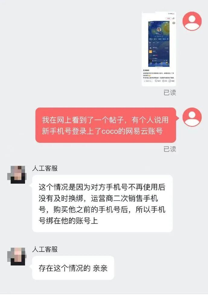 针对此事,网易云音乐客服表示存在此类情况。原因为原账号用户在手机号停用后未及时解绑,该号码经运营商回收并二次销售后,被新用户获得,就会出现账号的“继承”。客服表示,具体情况需要进一步登记核实。10月11日中午询问时,发帖网友称“网易云音乐官方已经来电告知解绑了。”