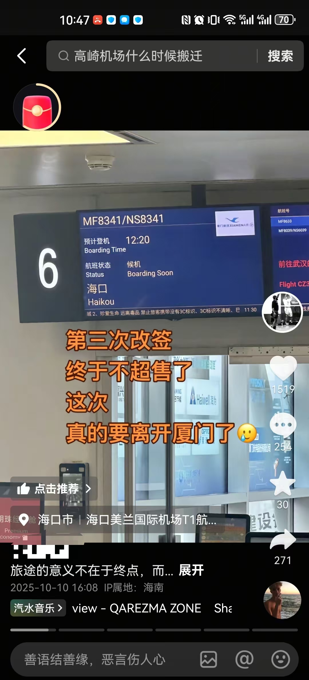 经历了两次航班超售后,10月10日小孙终于登机,航班也顺利起飞。在视频中,小孙配文“第三次改签终于不超售了,这次真的要离开厦门了。福建很好,但我得回我的小岛继续上学了。”小孙接受媒体采访时表示,他目前还是一名学生,两次超售加起来有1700元补充,这对他而言不是个小数目,这次国庆出游的钱都赚回来了。他也澄清了一些失实信息:“我是联订的机票和酒店,其中机票花了390元左右,不是网上传的300元。另外,第二次改签补偿是500元,不是网传的1200元。”