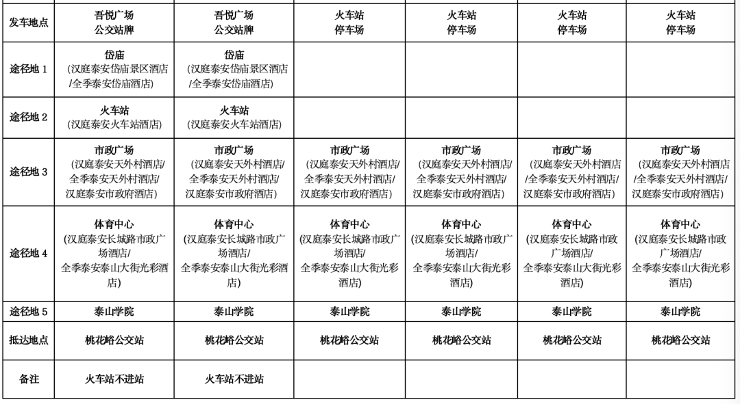 去年安排参考:由东岳通公交车提供,从【封禅大典】发车,经停 红门站牌—天外村站牌—桃花峪,票价约5元,11:30 / 12:30 / 13:30 各发一班。