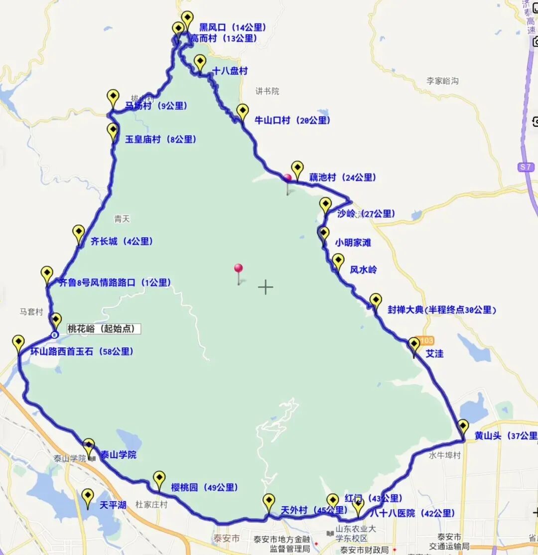 1.全程60公里:桃花峪(起始点)—齐鲁8号风情路路口(1公里)—齐长城(4公里)—玉皇庙村(8公里)—马场村(9公里)—高而村(13公里)—黑风口(14公里)—牛山口村(20公里)—藕池村(24公里)—沙岭(27公里)—封禅大典(半程终点32公里)—黄山头(37公里)—八十八医院(43公里)—天外村(45公里)—樱桃园(49公里)—环山路西首玉石(58公里)—桃花峪(60公里);