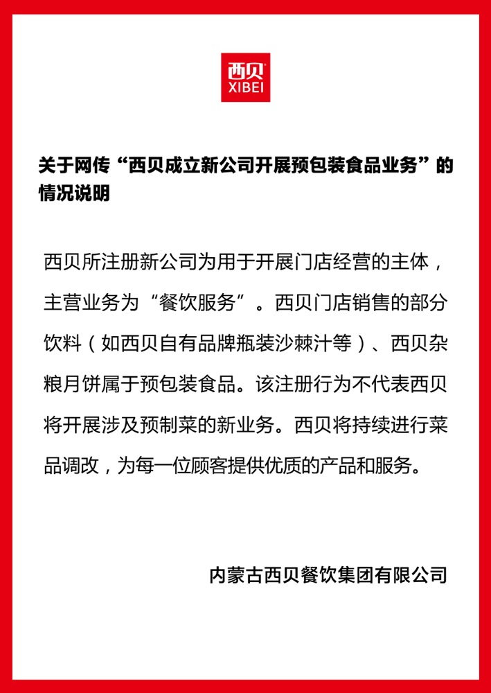 近日有消息称,企查查app显示,由内蒙古西贝餐饮集团有限公司(下称“西贝餐饮”)控股95%的“深圳市玉华美好餐饮管理有限公司”于9月30日成立,经营范围为“预包装食品销售”“食品互联网销售”等领域。此举被外界认为:西贝成立新公司,开卖预制菜。 不过,13日,西贝方面发布声明表示,该注册行为不代表西贝将开展预制菜业务。该公司为西贝门店提供餐饮服务,仅制作西贝自有瓶装饮料、杂粮月饼等预包装产品。