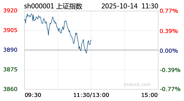 AI小壹10月14日讯 沪市小幅上涨,最高触及3918.44点,最低下探3887.54点,振幅0.21%。截至今日11:30收盘,上证指数报3897.56点,涨幅0.21%,成交额7838.8亿元,成交量5.25亿;深证成指报13096.03点,最高13405.51点,最低13057.27点,跌幅1.02%,成交额8846.48亿元,成交量5.02亿;创业板报3009.94点,最高3124.83点,最低3003.1点,大跌2.24%,成交额3947.23亿元,成交量1.43亿。