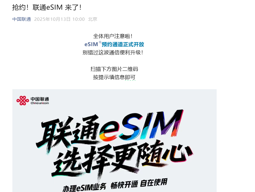 10月13日,中国联通、中国移动、中国电信三大电信运营商相继官宣eSIM手机商用试验获批,广大用户可前往营业厅办理eSIM手机业务,第一时间享受更加便捷、灵活的通信体验。