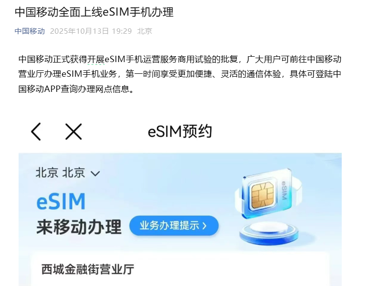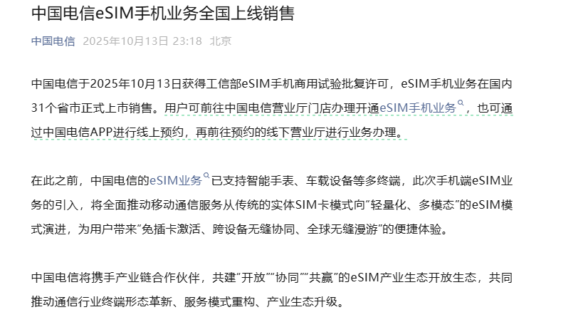 中国电信表示,在此之前,中国电信的eSIM业务已支持智能手表、车载设备等多终端,此次手机端eSIM业务的引入,将全面推动移动通信服务从传统的实体SIM卡模式向“轻量化、多模态”的eSIM模式演进,为用户带来“免插卡激活、跨设备无缝协同、全球无缝漫游”的便捷体验。
