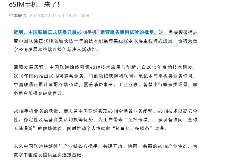 中国联通表示,自2015年启动技术研发,2018年国内推出eSIM可穿戴业务,再到陆续获得物联网、笔记本与平板类业务许可。中国联通已累计适配终端75款,覆盖消费电子、工业互联、智慧出行等多类场景,服务用户规模突破数百万。