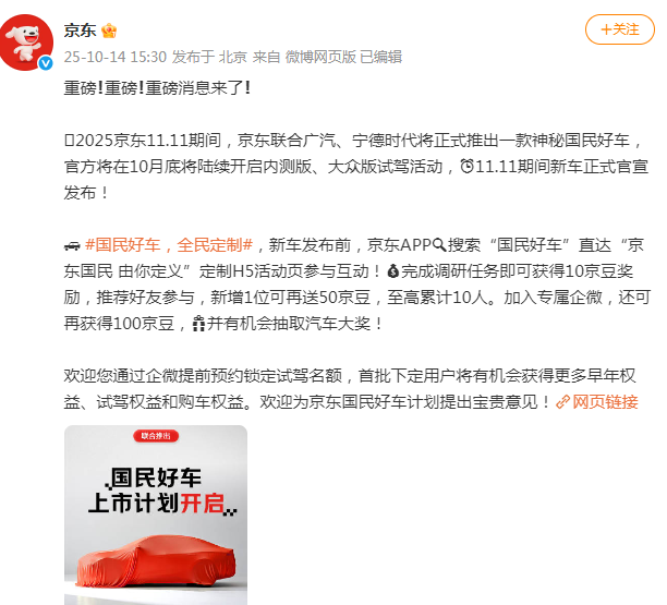 10月14日,京东微博账号发文称:2025京东11.11期间,京东联合广汽、宁德时代将正式推出一款神秘国民好车,官方将在10月底将陆续开启内测版、大众版试驾活动,⏰11.11期间新车正式官宣发布!