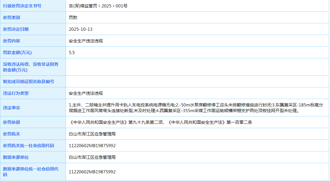 通化矿业(集团)有限责任公司道清煤矿因安全生产违法违规被罚