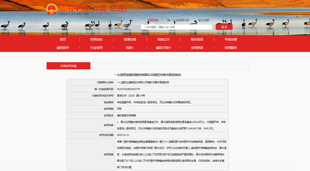 齐鲁晚报·齐鲁壹点记者于信用中国(云南·昭通)行政处罚栏了解到,10月12日,一心堂药业集团股份有限公司德钦河香中路连锁店因存在超量开药、未核验参保人医保凭证、无处方销售处方药等违规项目,德钦县医疗保障局对其发出行政处罚决定书医保处字〔2025〕第014号,责令其立即整改违规使用医保基金行为,责令其退回违规使用的医保基金1246.65元;对超量开药、未核验参保人医保凭证、无处方销售处方药违规项目涉及基金处2倍罚款(1246.65*2倍、2493.3元)。