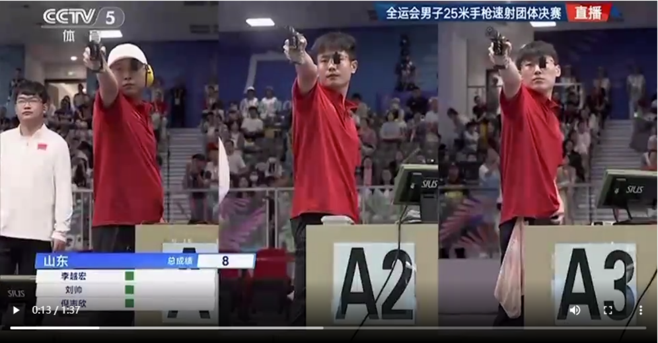 在男子25米手枪速射团体资格赛中,李越宏领衔山东队以1749环的成绩排名第一,与陕西队争夺金牌。决赛过程中,山东队率先得2分,并在2平之后将比分扩大到6比2。随后陕西队连续得分,双方8比8打平。关键时刻,山东顶队住压力以10比8战胜对手拿下金牌。