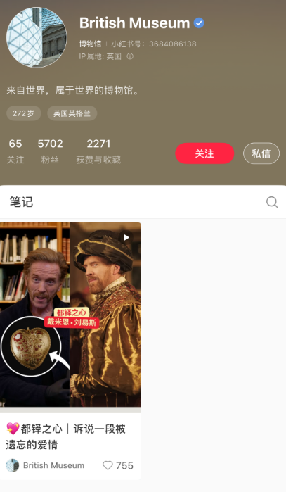 近日,有网友发文称,英国大英博物馆在小红书开通账号并发布首条入驻视频。据查询,该账号名称为British Museum,身份认证为博物馆,账号简介为“来自世界,属于世界的博物馆”,账号目前拥有5702名粉丝。