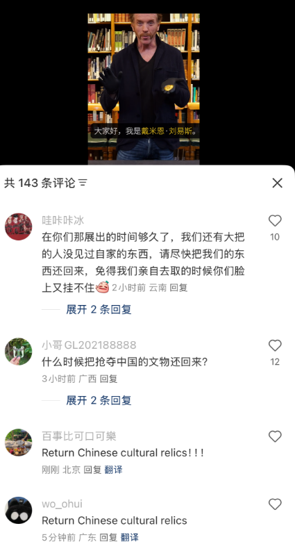 现在,账号内容列表有一段介绍英国宝石的视频,有网友在该视频下留言“请归还文物”。