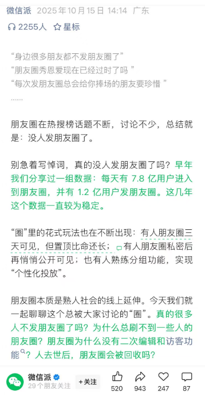 10月15日,“微信派”微信公众号发布最新一期播客,聊到了“真的很多人不发朋友圈了吗?”“人去世后,朋友圈会被回收吗?”等话题。