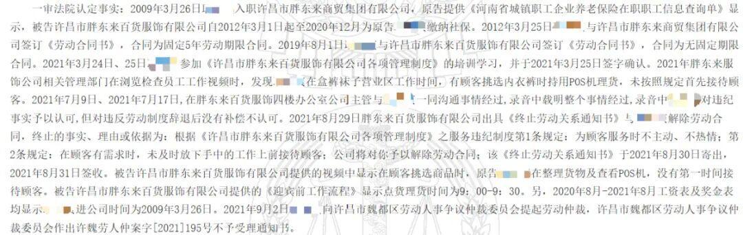 近日,记者从中国裁判文书网获悉,许昌市胖东来百货服饰有限公司(下称“百货服饰公司”)一员工因“未按照规定首先接待顾客”,被公司认定为严重违纪并解除劳动合同。该员工随后提起诉讼,河南省许昌市两级法院审理后均认定公司解除合同合法,驳回了其赔偿请求。