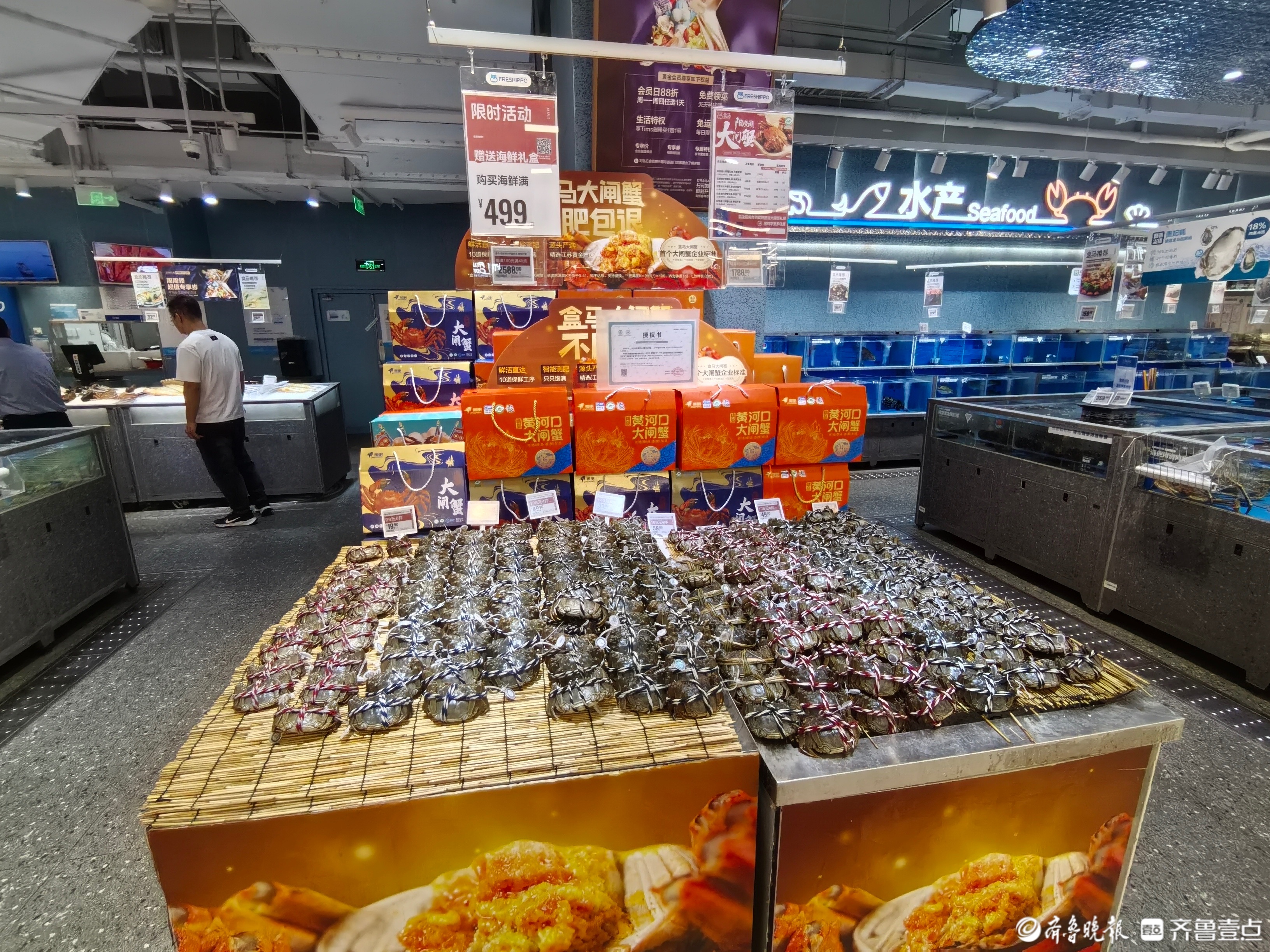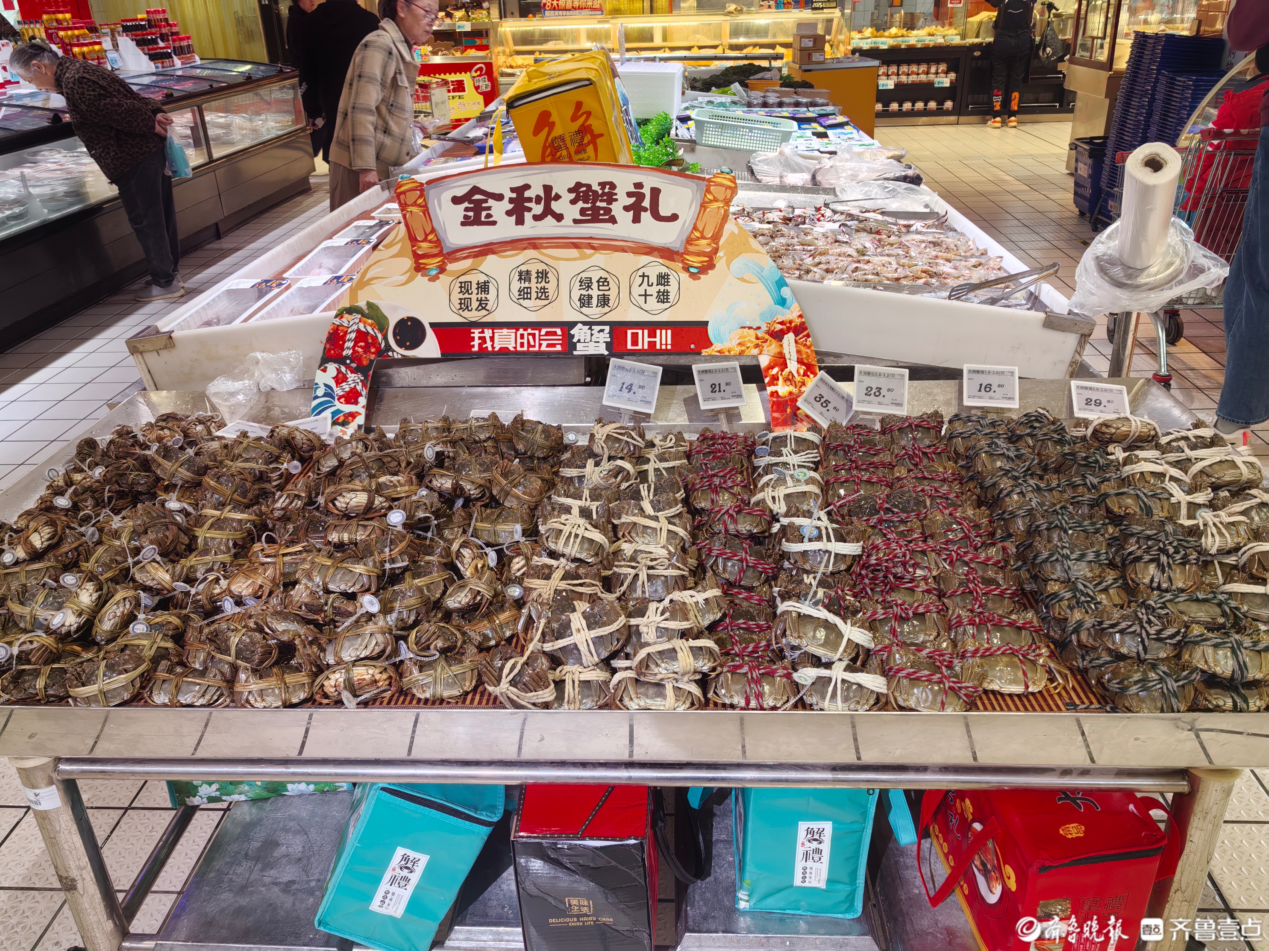 济南各大商超的水产区也掀起了“蟹战”。记者走访发现,货架上阳澄湖、江苏兴化、黄河口三大蟹种形成“三足鼎立”之势,微山湖大闸蟹则比较少见,不同产地、规格的大闸蟹,让市民的“吃蟹清单”越来越丰富。