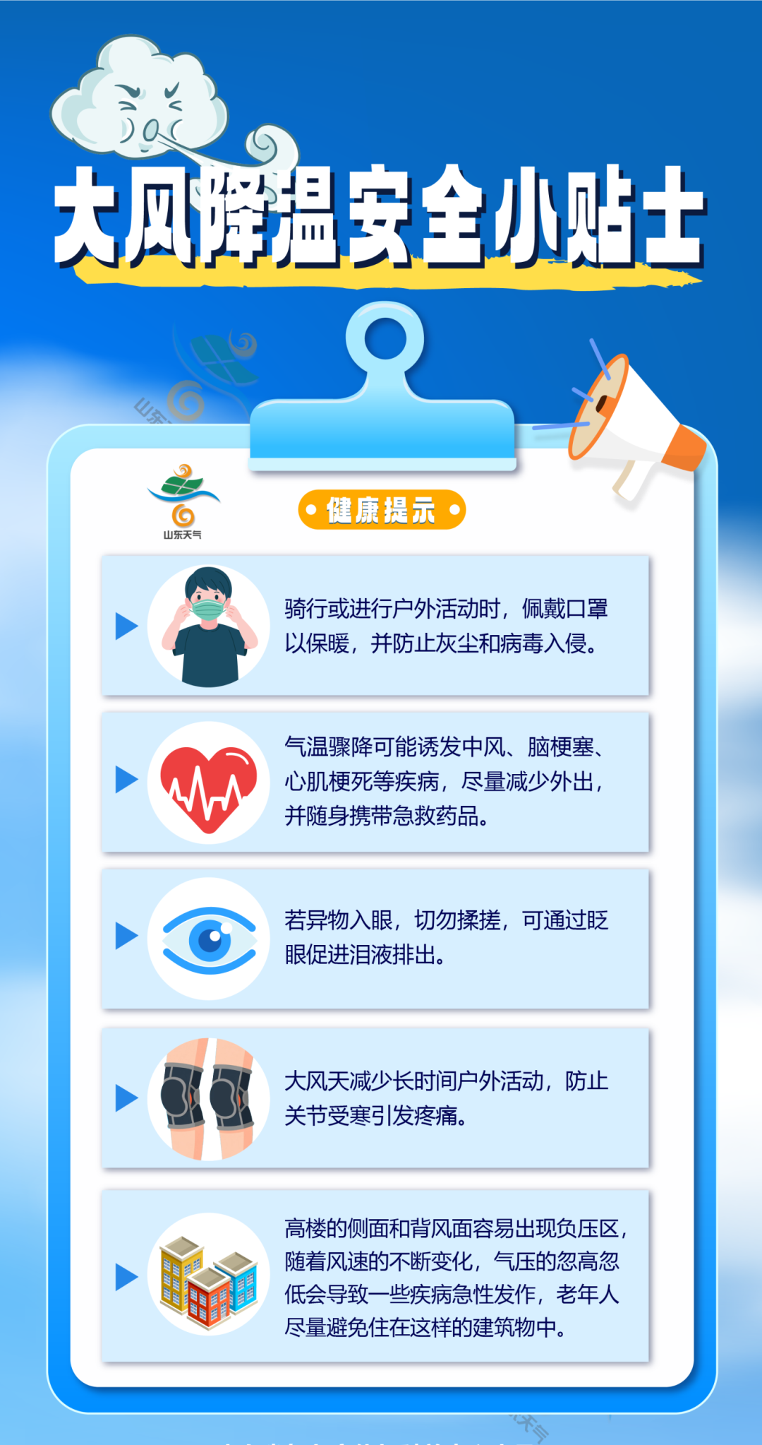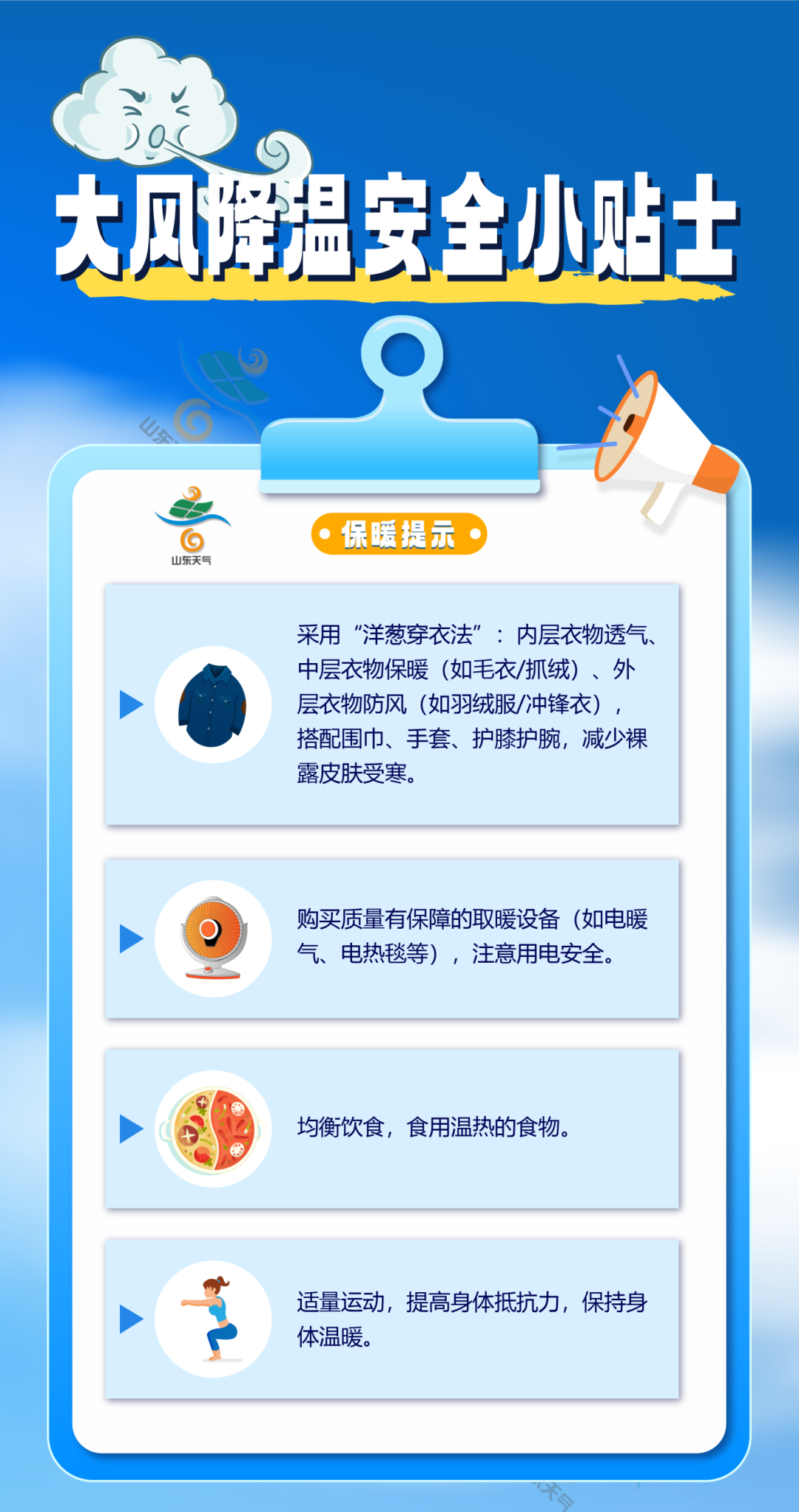 全省天气多云间晴。北风,滨州、东营、潍坊、临沂、日照和半岛地区5~6级阵风7~8级,其他地区4~5级阵风6~7级减弱到4级。夜间最低气温:内陆地区7℃左右,沿海地区10℃左右。最高气温:鲁南地区17℃左右,其他地区14℃左右。