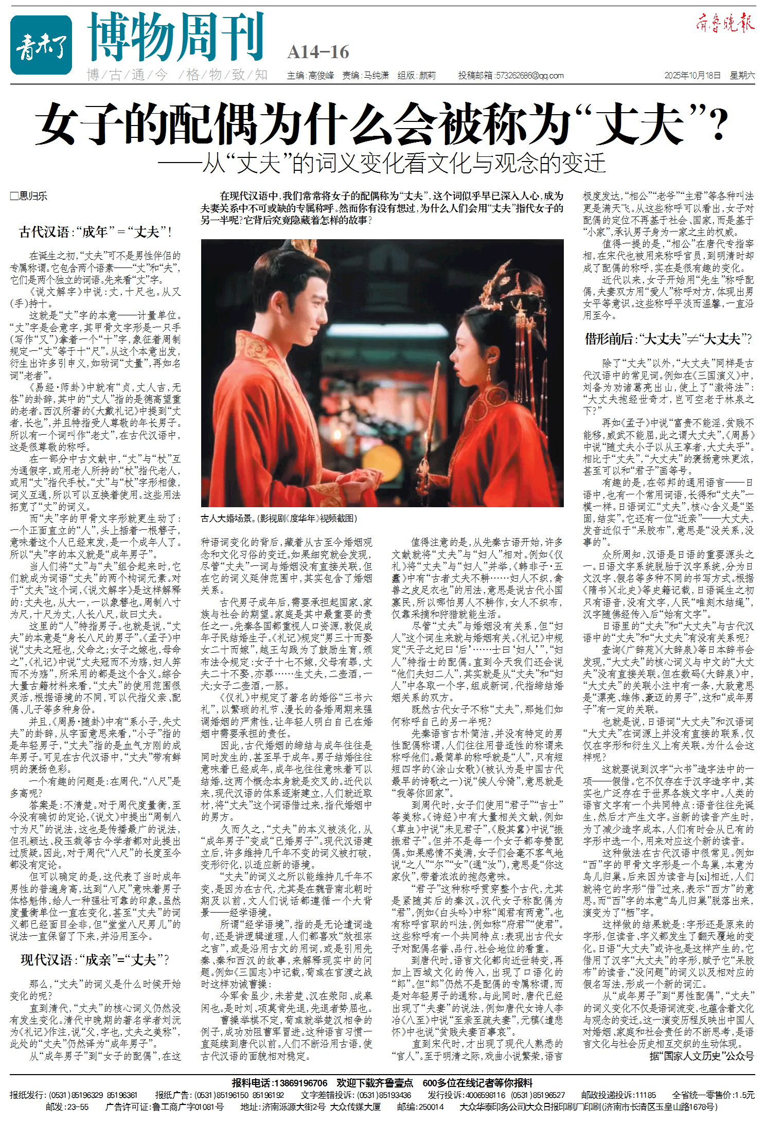 尽管“丈夫”与婚姻没有关系,但“妇人”这个词生来就与婚姻有关。《礼记》中规定“天子之妃曰‘后’……士曰‘妇人’”,“妇人”特指士的配偶。直到今天我们还会说“他们夫妇二人”,其实就是从“丈夫”和“妇人”中各取一个字,组成新词,代指缔结婚姻关系的双方。