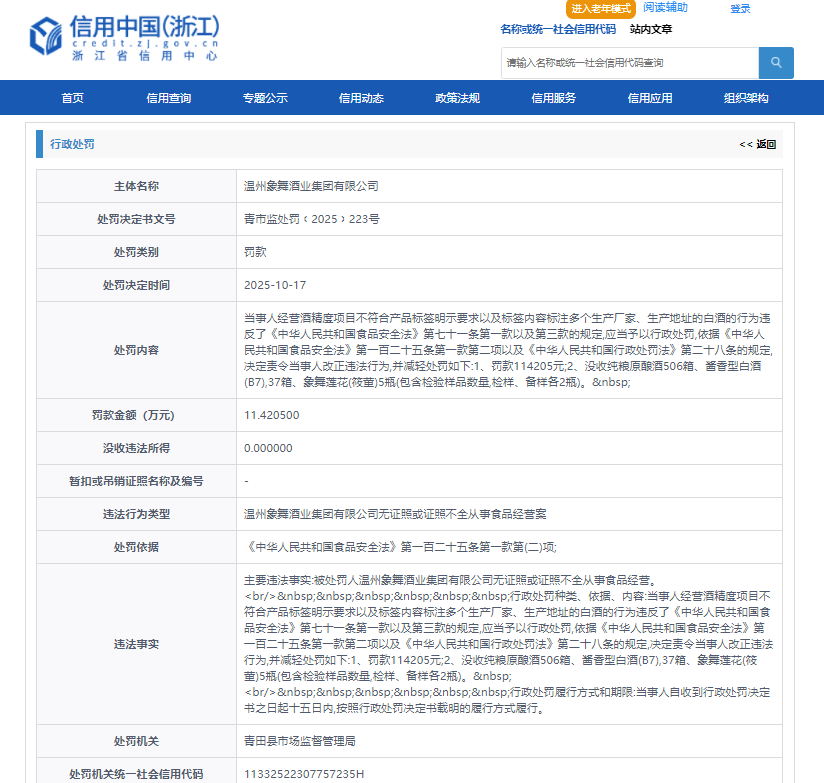 近日,青田县市场监督管理局对温州象舞酒业集团有限公司作出行政处罚决定,罚款114205元,并没收一批不符合规定的白酒产品。该处罚决定书文号为青市监处罚﹝2025﹞223号,处罚决定时间为2025年10月17日。