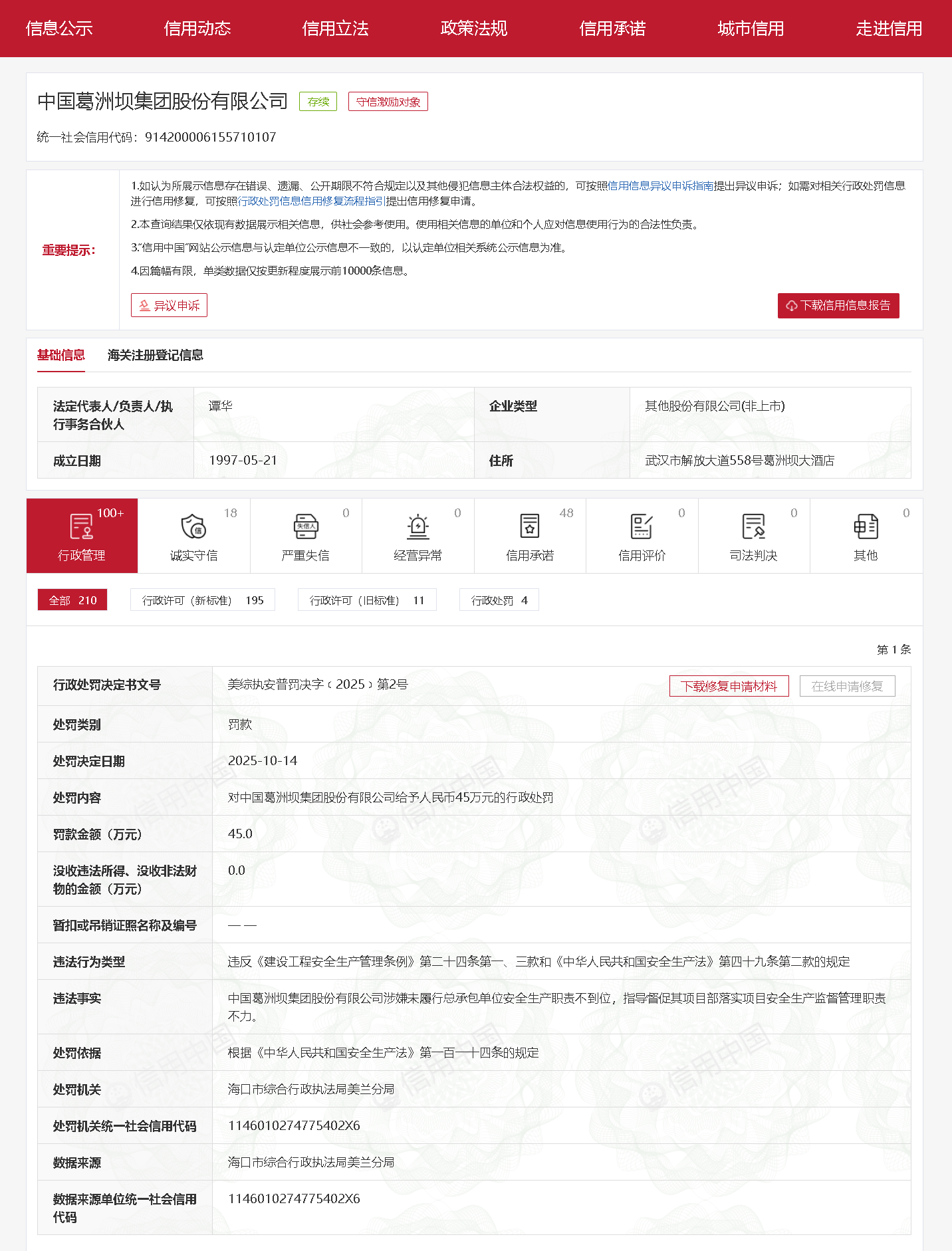 近日,齐鲁晚报·齐鲁壹点记者从信用中国获悉,中国葛洲坝集团股份有限公司涉嫌未履行总承包单位安全生产职责不到位,指导督促其项目部落实项目安全生产监督管理职责不力。被海口市综合行政执法局美兰分局罚款45万元。