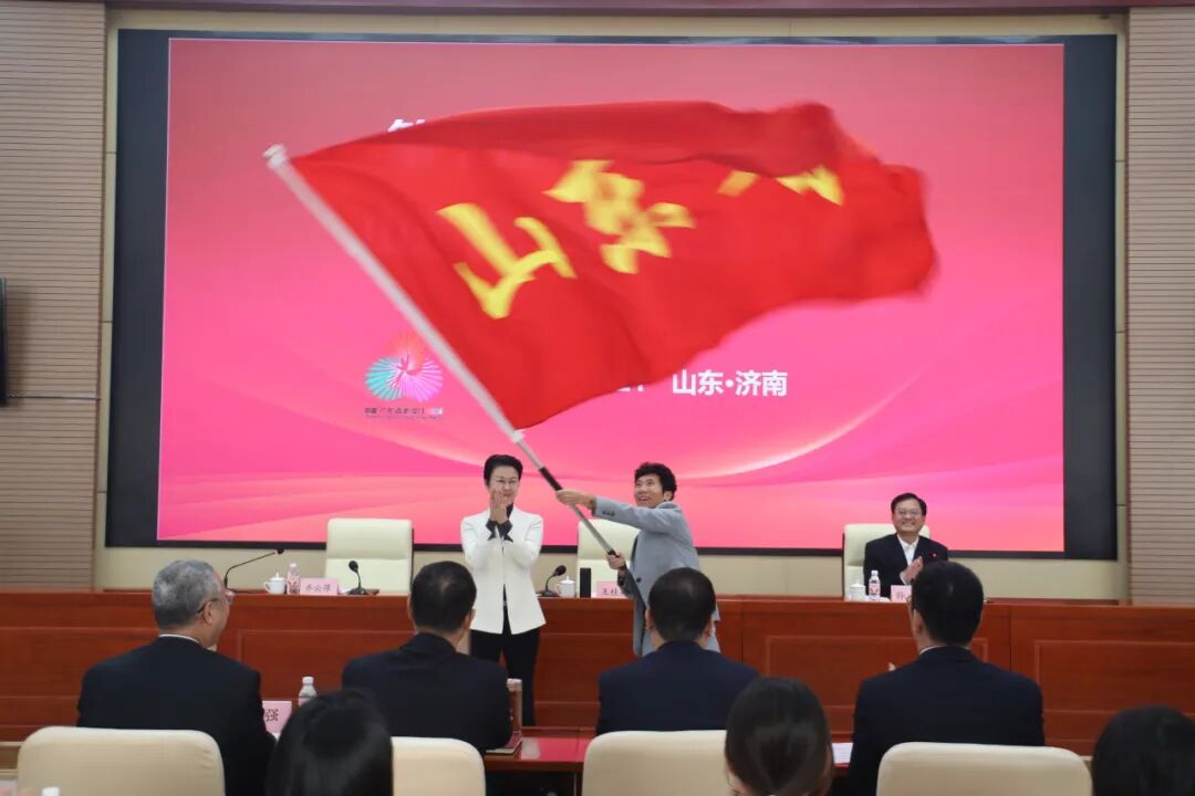 10月21日上午,第十五届全国运动会山东省代表团成立大会在济南举行。副省长、代表团团长王桂英为代表团授旗并讲话,省政府副秘书长孙永主持会议。