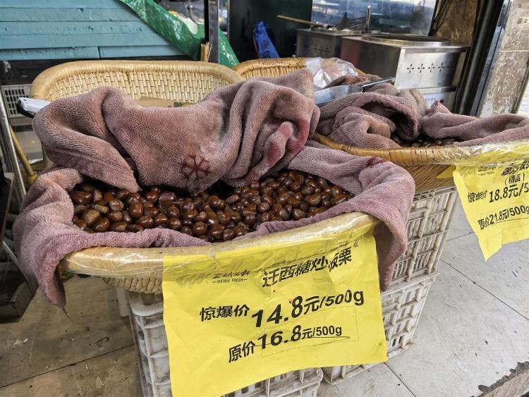 在黄孝河路上卖13.8元一斤糖炒板栗的商家介绍,作为专营炒货的连锁品牌,他们在电商平台上推出的团购价更加便宜,主要就是为了吸引客流,进店以后可以推荐更多的产品:“在电商平台上最低9.9元就能团购一斤,也不亏。还能引来更多客流。”