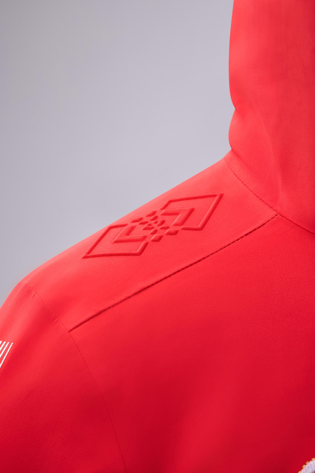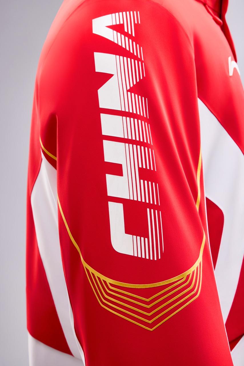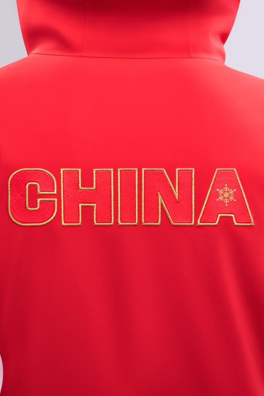 领奖服以红、白两色为主色调, “中国红”充分彰显中国文化元素,在正面勾勒出象征着五角星的线条;“雪山白”灵感源自冬季运动场景,也融入了东方审美里的留白意境,并在侧身搭配以雪道为原型的金色流线型线条为点缀,全身以上红下白的色彩拼接,凸显中国运动健儿的挺拔身姿。