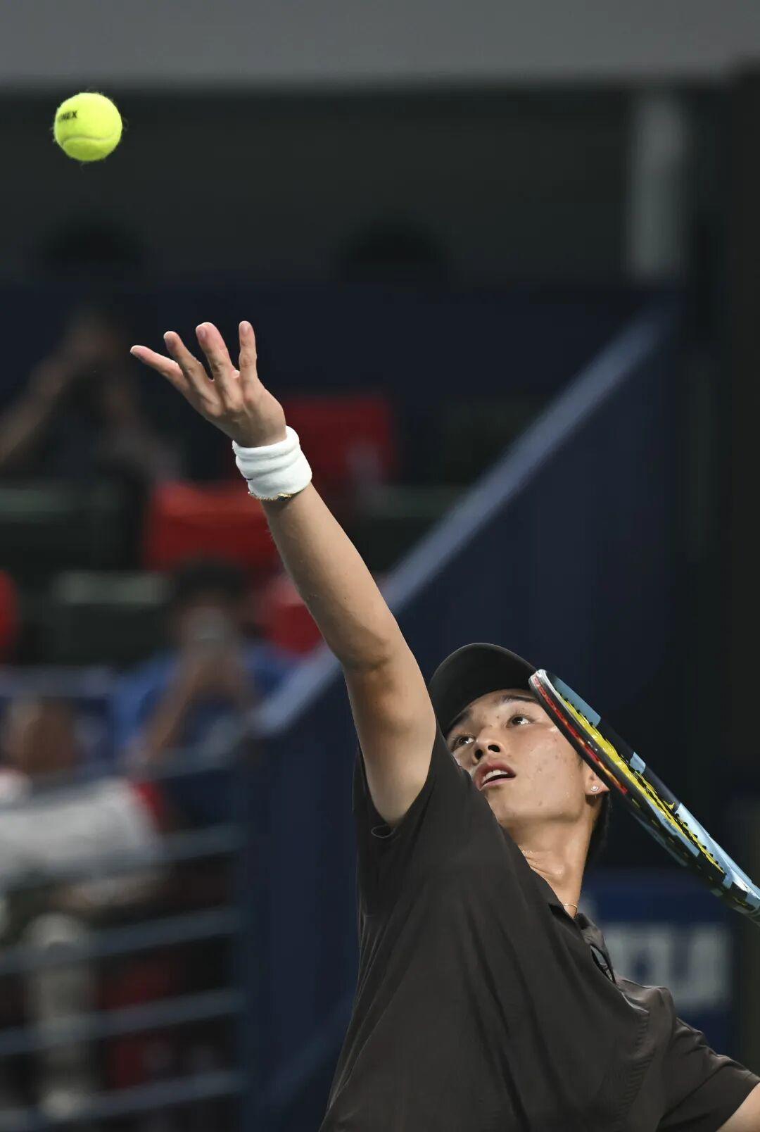 10月4日,商竣程在比赛中发球。当日,在2025年ATP上海网球大师赛男单第二轮比赛中,中国选手商竣程2比0战胜俄罗斯选手卡恰诺夫,晋级下一轮。新华社记者 陈浩明 摄