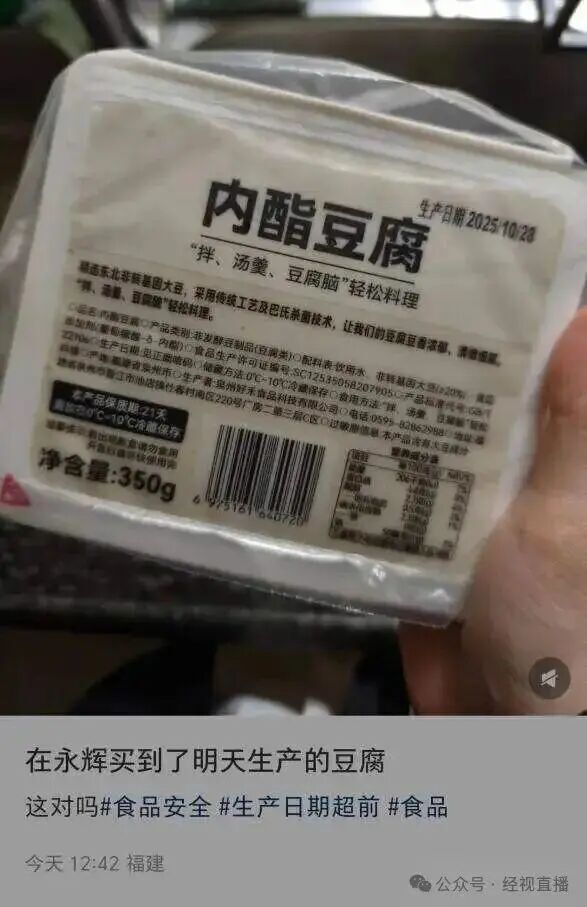 10月27日,福建泉州一名消费者发文称,在永辉超市购买到一盒内酯豆腐,其包装上标注的生产日期竟是“2025年10月28日”——也就是“明天”。这盒“穿越豆腐”迅速引发关注。
