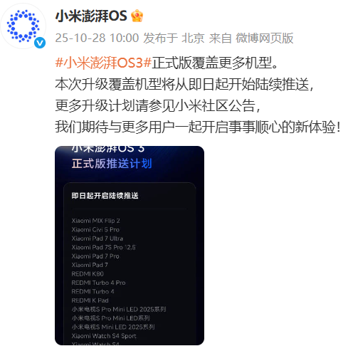 10月28日,小米澎湃OS官方微博宣布,澎湃OS3正式版即日起开始陆续覆盖更多机型。