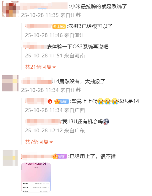 对此,有网友表示已经用上澎湃OS系统,很不错,也有网友表示,自己的设备还未收到推送。