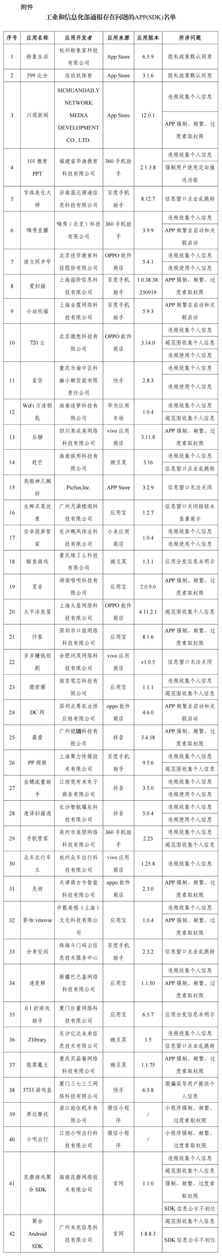 根据中央网信办、工业和信息化部、公安部、市场监管总局等四部门联合发布的《关于开展2025年个人信息保护系列专项行动的公告》,依据《个人信息保护法》《网络安全法》《电信条例》《电信和互联网用户个人信息保护规定》等法律法规,我部对APP、SDK违法违规收集使用个人信息等问题开展治理。近期,经组织第三方检测机构进行抽查,共发现42款APP及SDK存在侵害用户权益行为(详见附件),现予以通报。