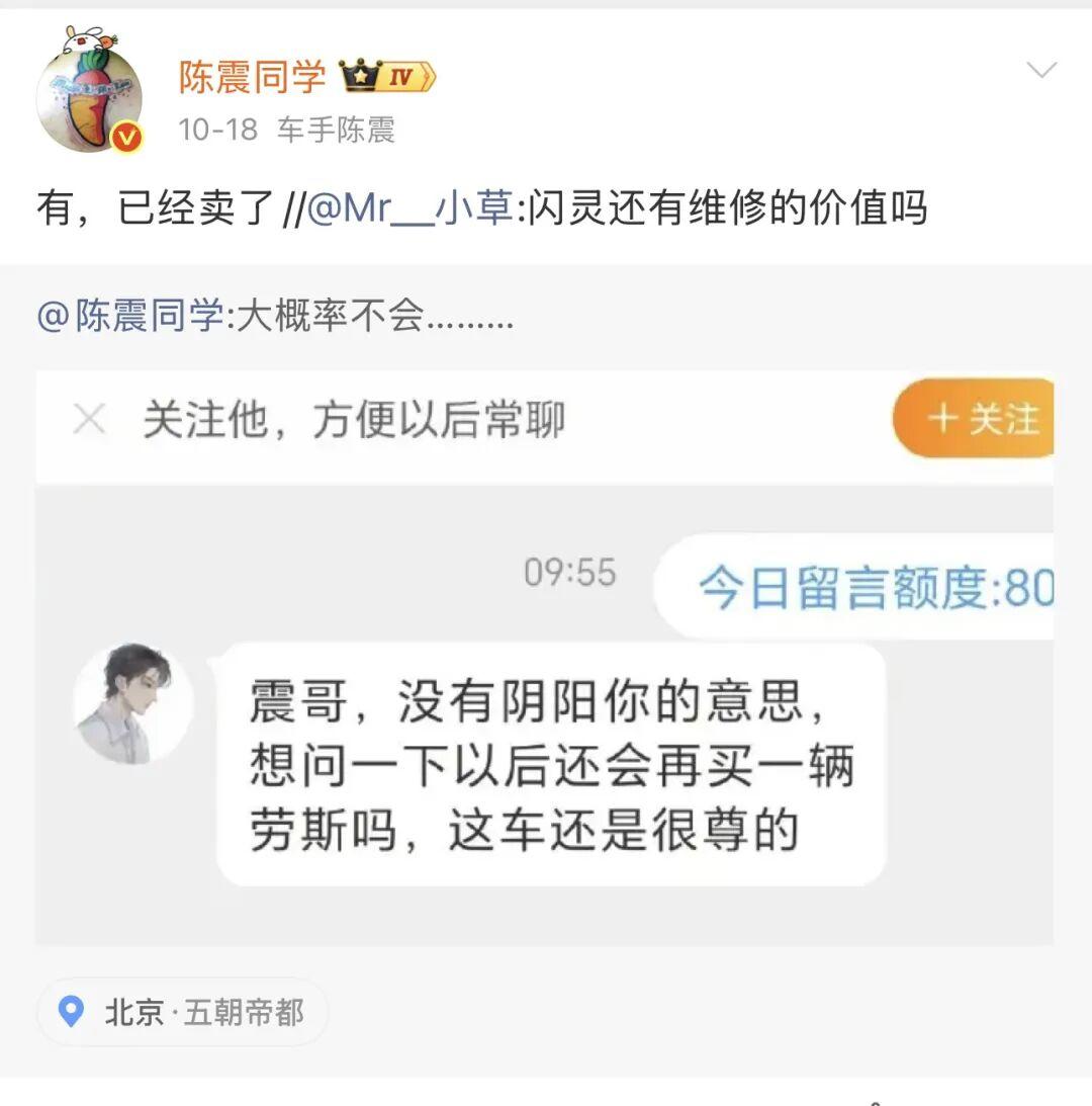 10月18日,陈震在微博上回复网友时表示,劳斯莱斯闪灵已经卖掉,以后大概率不会再买劳斯莱斯了。