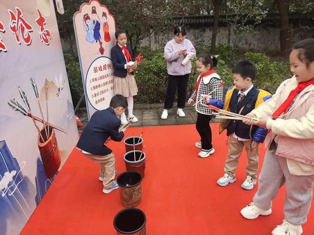 在“幼年辛弃疾”主题区,“投壶论志”环节吸引众多孩子参与。孩子们手持箭矢,站在指定距离外瞄准壶口,有的屏住呼吸调整姿势,有的轻声计数调整节奏,投中时立刻露出灿烂笑容。投壶胜利者还需回答“辛弃疾幼年立志的典故”“稼轩故里所在”等文化题目,在趣味互动中学习历史知识,感受少年辛弃疾立志报国的豪情。