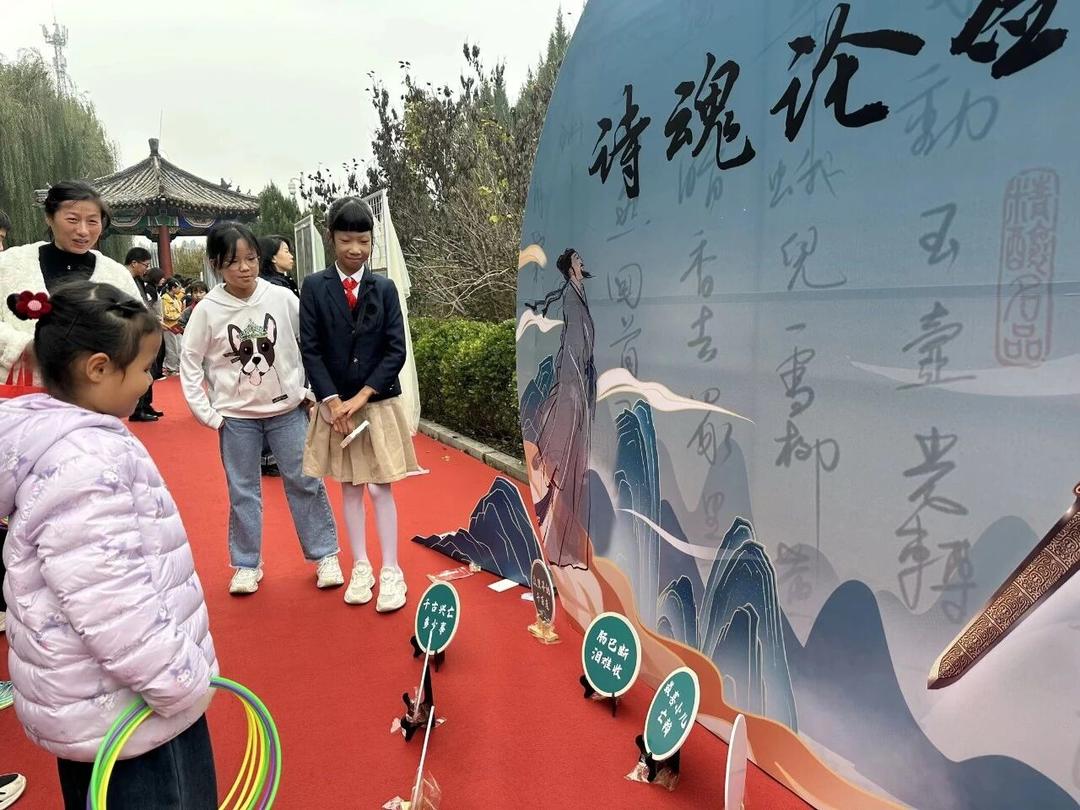 “青年辛弃疾”展区以诗词为核心,展板上陈列《破阵子・为陈同甫赋壮词以寄之》《青玉案・元夕》等经典作品,开展“诗词对对碰”活动。参与者需根据上句对出下句,不少家长与孩子并肩讨论,有的孩子轻声背诵积累的诗句,家长在旁补充提示,答对后共同在打卡图上盖章,展现出“家校共学”的温馨场景。