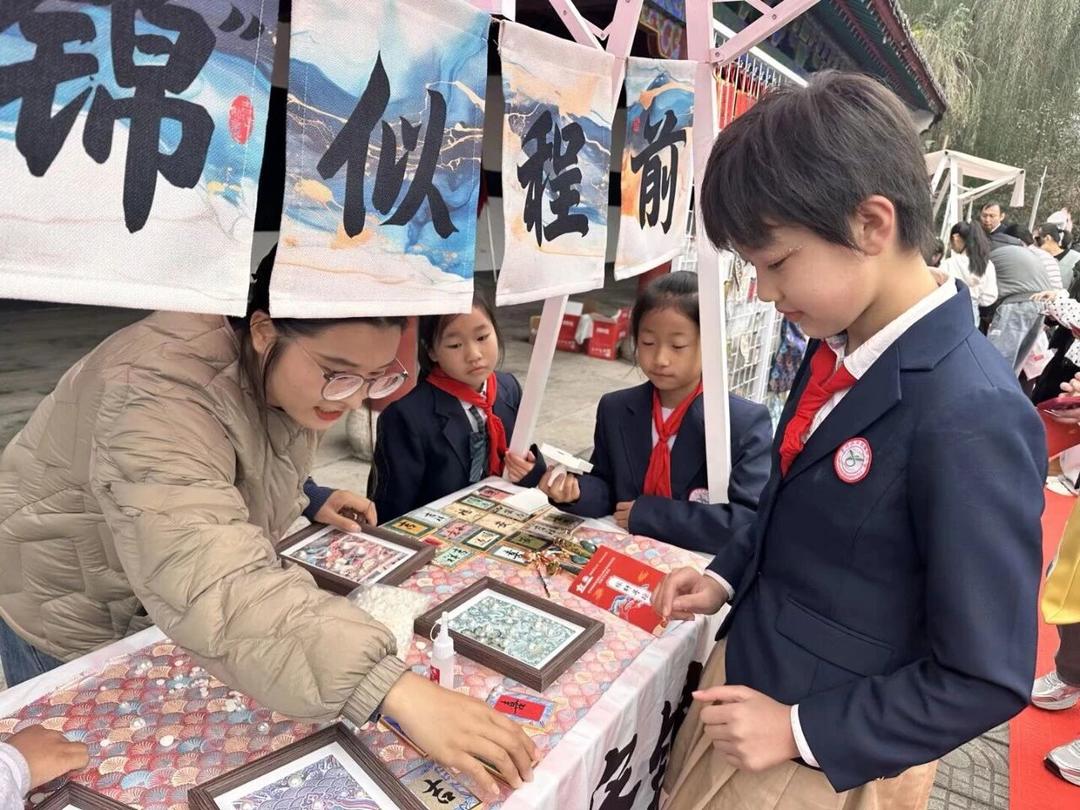 “文创趣享”板块融入多项非遗体验项目,在漆艺展示环节,非遗传承人现场演示上色技巧,学生们围站一旁认真观察,部分孩子还尝试用小刷子蘸取颜料涂抹木牌;“前程似锦”宋锦制作区,家长与孩子合作穿插丝线,完成简易宋锦书签;“本草香驿”展区则陈列多种常见中药,讲解员同步介绍中药功效及辛弃疾诗词中提及的药用植物,让学生在零距离接触中感受华夏美学与传统医药文化的深厚底蕴,实现稼轩文化与非遗精神的交相辉映。