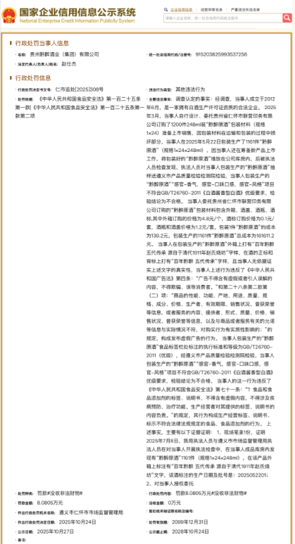 根据仁怀市市场监督管理局于2025年10月24日作出的《仁市监处[2025]308号》行政处罚决定书,该局在执法检查中发现,黔醉酒业于2025年5月22日包装生产的1161件“黔醉原酒”存在多项违法行为。