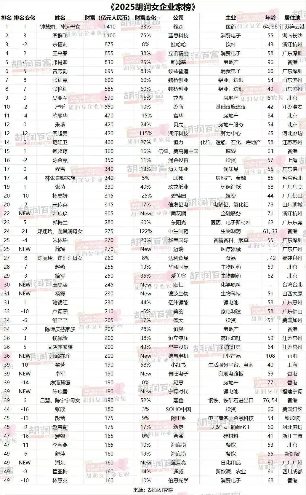 10月30日,胡润研究院发布《2025胡润女企业家榜》,列出了今年胡润百富榜中的前50名女企业家。来自中国创新药头部企业翰森的钟慧娟、孙远母女,以1410亿元财富首次成为中国女首富。